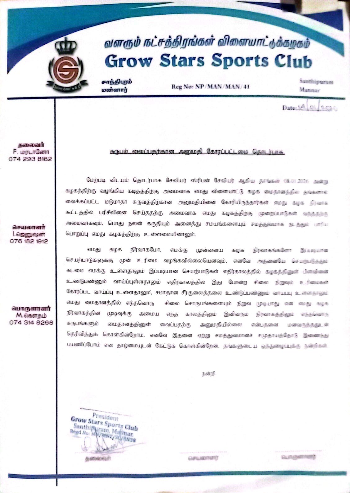 குறித்த விடயம் தொடர்பில் விளையாட்டு கழக பிரதிநிதிகள் மன்னார் நகரசபை தலைவரிடம் வினாவிய போது அதற்கு அனுமதி வழங்கப்பட்டு விட்டதாகவும் சபையில் அனுமதி கிடைத்துவிட்டதாகவும் தலைவரால் தெரிவிக்கப்பட்டுள்ளது.