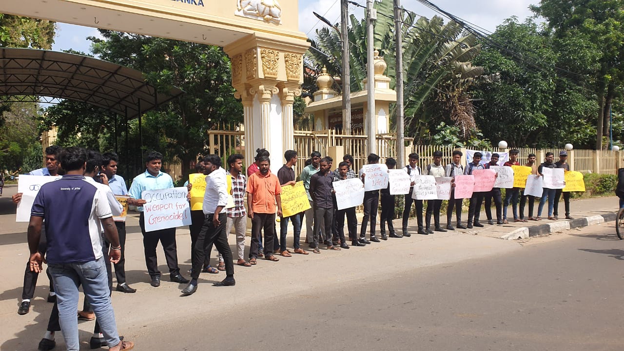 தையிட்டி விகாரை அமைக்கப்பட்டதை எதிர்த்து யாழ்ப்பாண பல்கலைக்கழக மாணவர்கள் பல்கலைக்கழகத்துக்கு முன்பாக போராட்டத்தில் ஈடுபட்டனர்.