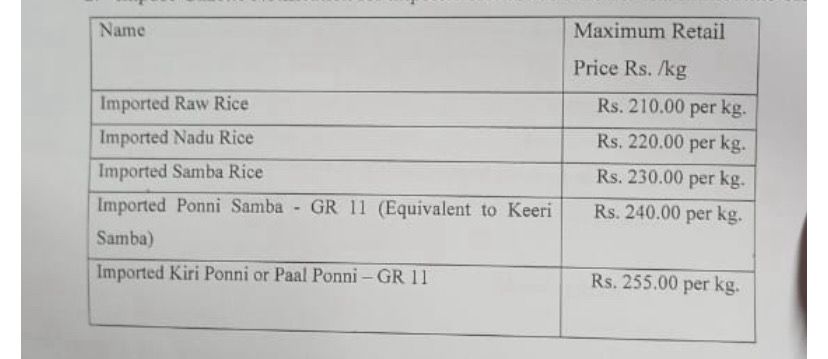 அதன்படி, இறக்குமதி செய்யப்படும் ஒரு கிலோ கிராம் பச்சை அரிசியின் அதிகபட்ச சில்லறை விலை  210 ரூபாவாகவும், இறக்குமதி செய்யப்படும் ஒரு கிலோ கிராம் நாட்டு அரிசியின் அதிகபட்ச சில்லறை விலை 220 ரூபாவாகவும் நிர்ணயிக்கப்பட்டுள்ளது.