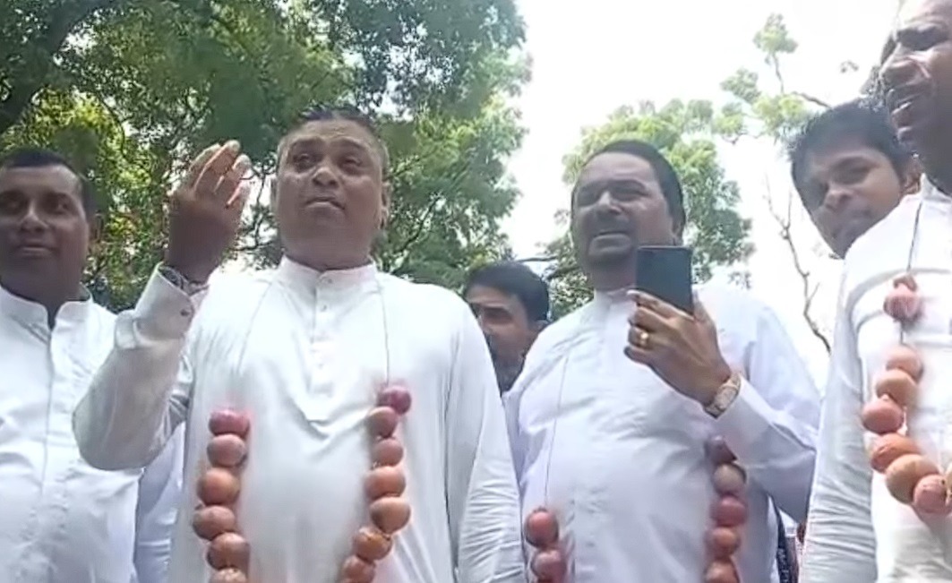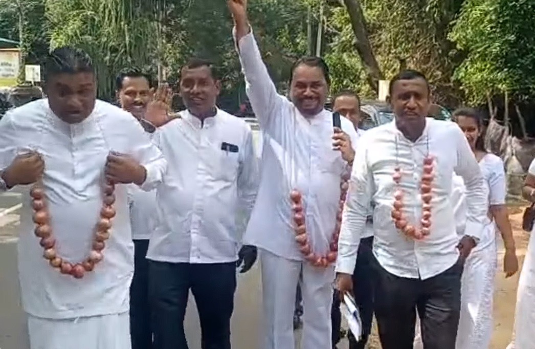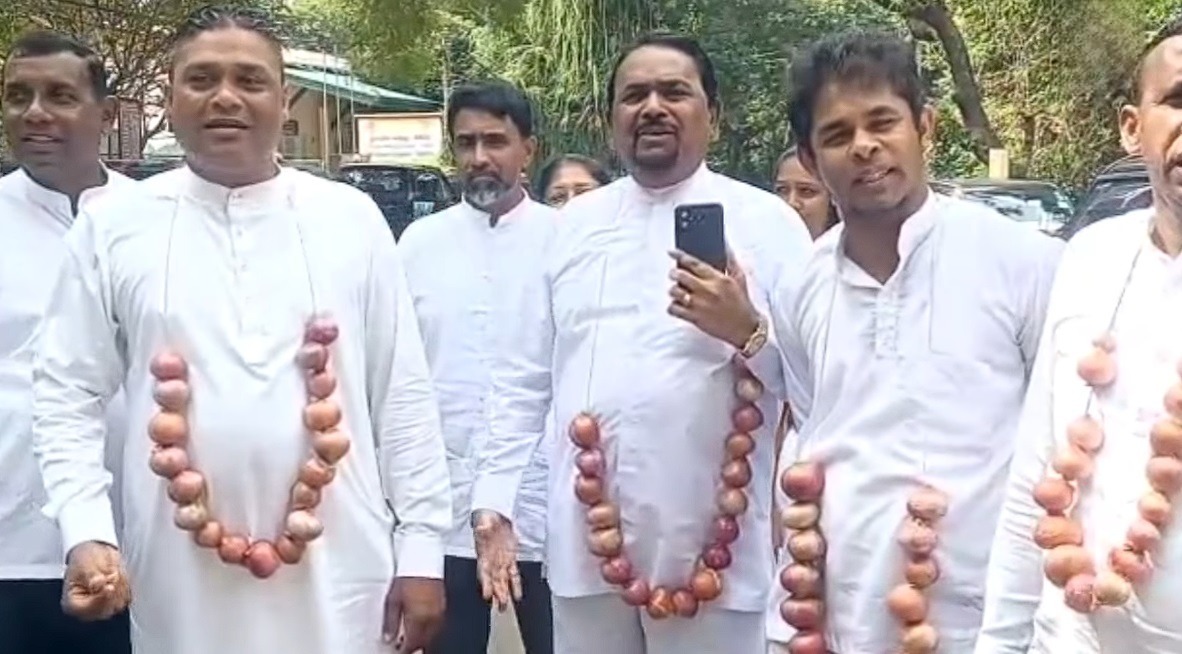 உள்நாட்டுப் பெரிய வெங்காயத்தின் விலை தொடர்பாக எழுந்துள்ள பிரச்சினைக்கு எதிர்ப்புத் தெரிவிக்கும் வகையில் அவர்கள் இவ்வாறு வெங்காயத்திலான மாலை அணிந்து சென்றுள்ளனர்.
