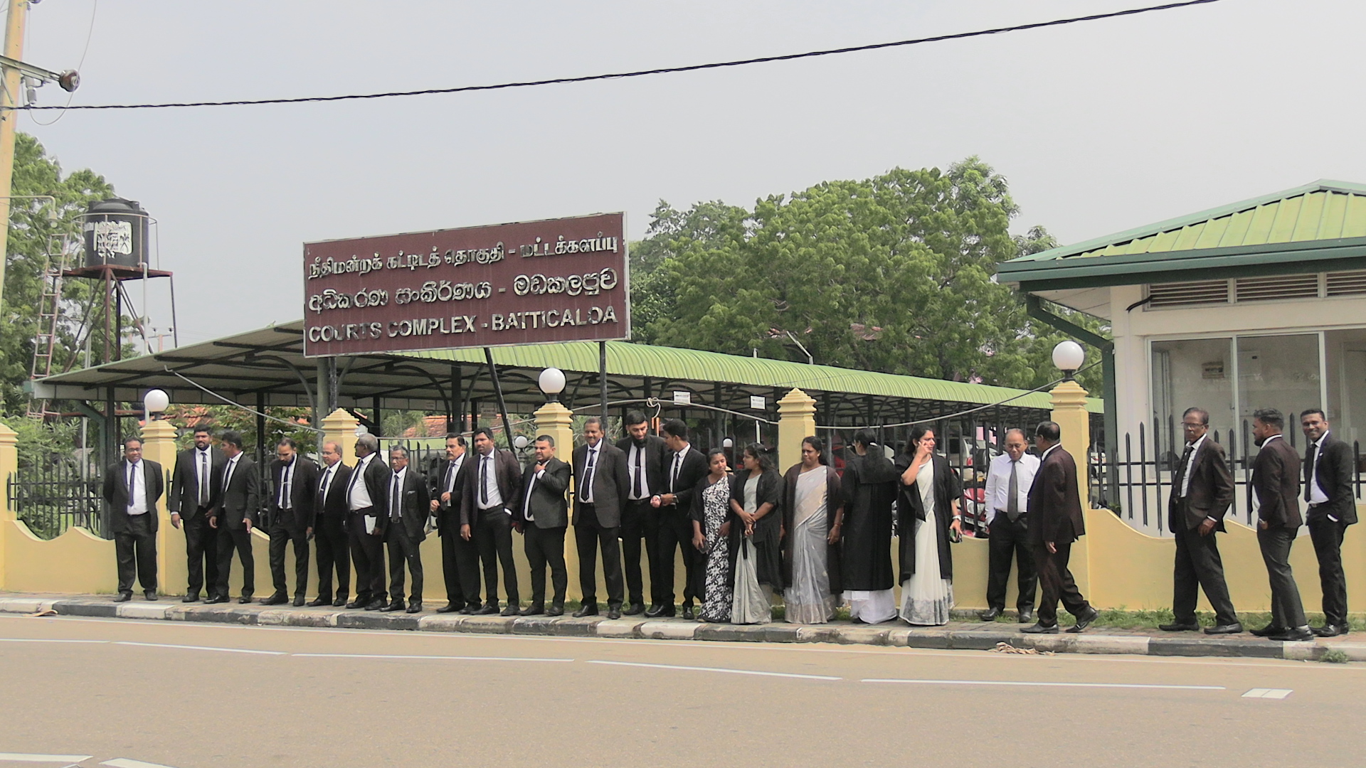 மட்டக்களப்பு நீதிமன்ற கட்டட தொகுதிக்கு முன்பாக ஒன்றுகூடிய சட்டத்தரணிகள் அமைதிமுறையில் போராட்டத்தினை நடாத்தினார்கள்.
