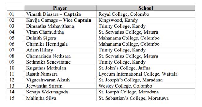 19 வயதுக்குட்பட்டோருக்கான ஆண்களுக்கான கிரிக்கெட் உலகக் கிண்ணத் தொடரில் பங்கேற்கும் 15 பேர் கொண்ட இலங்கை குழாத்தை இலங்கை கிரிக்கெட் தெரிவுக்குழு பெயரிட்டுள்ளது.