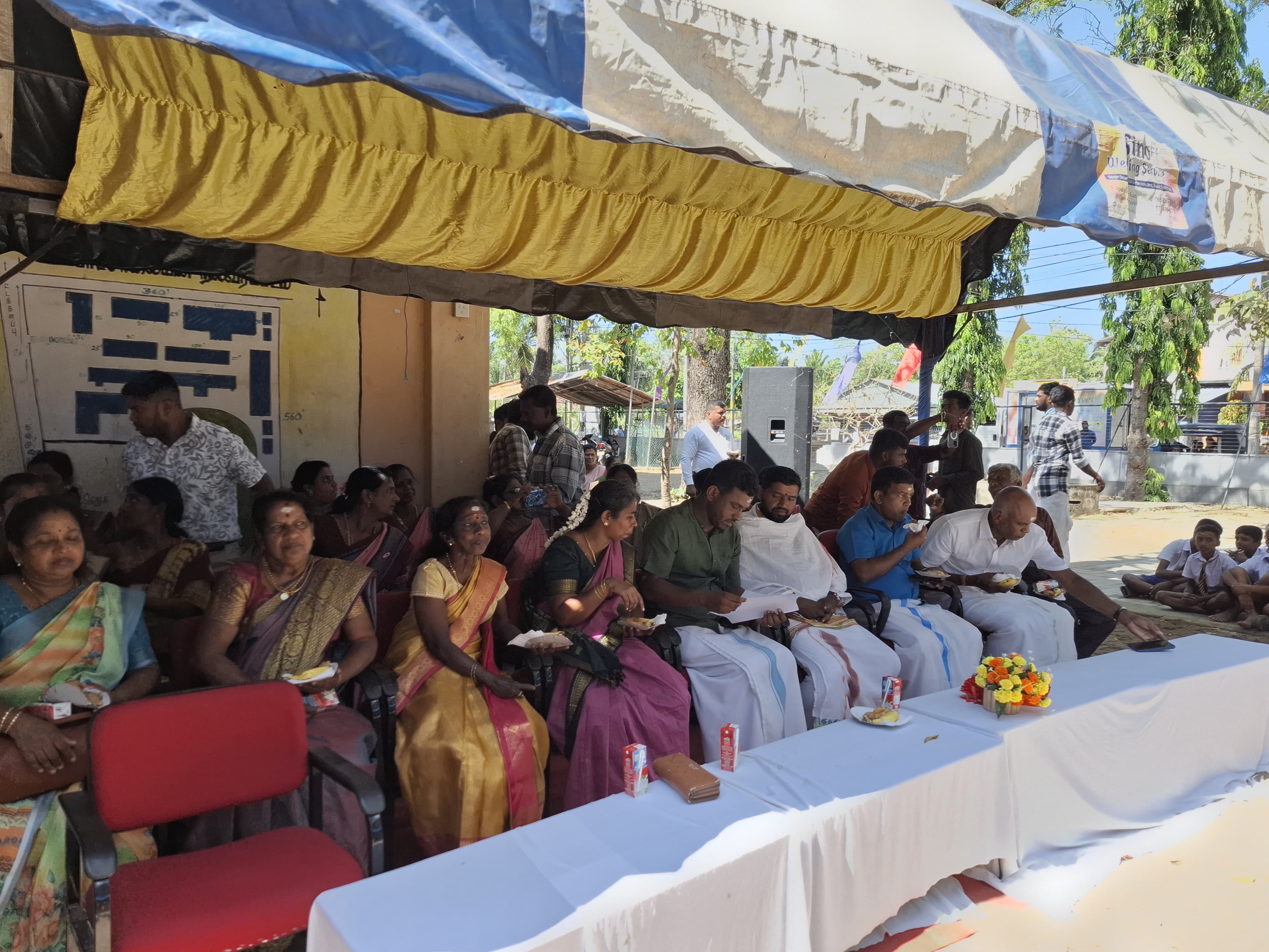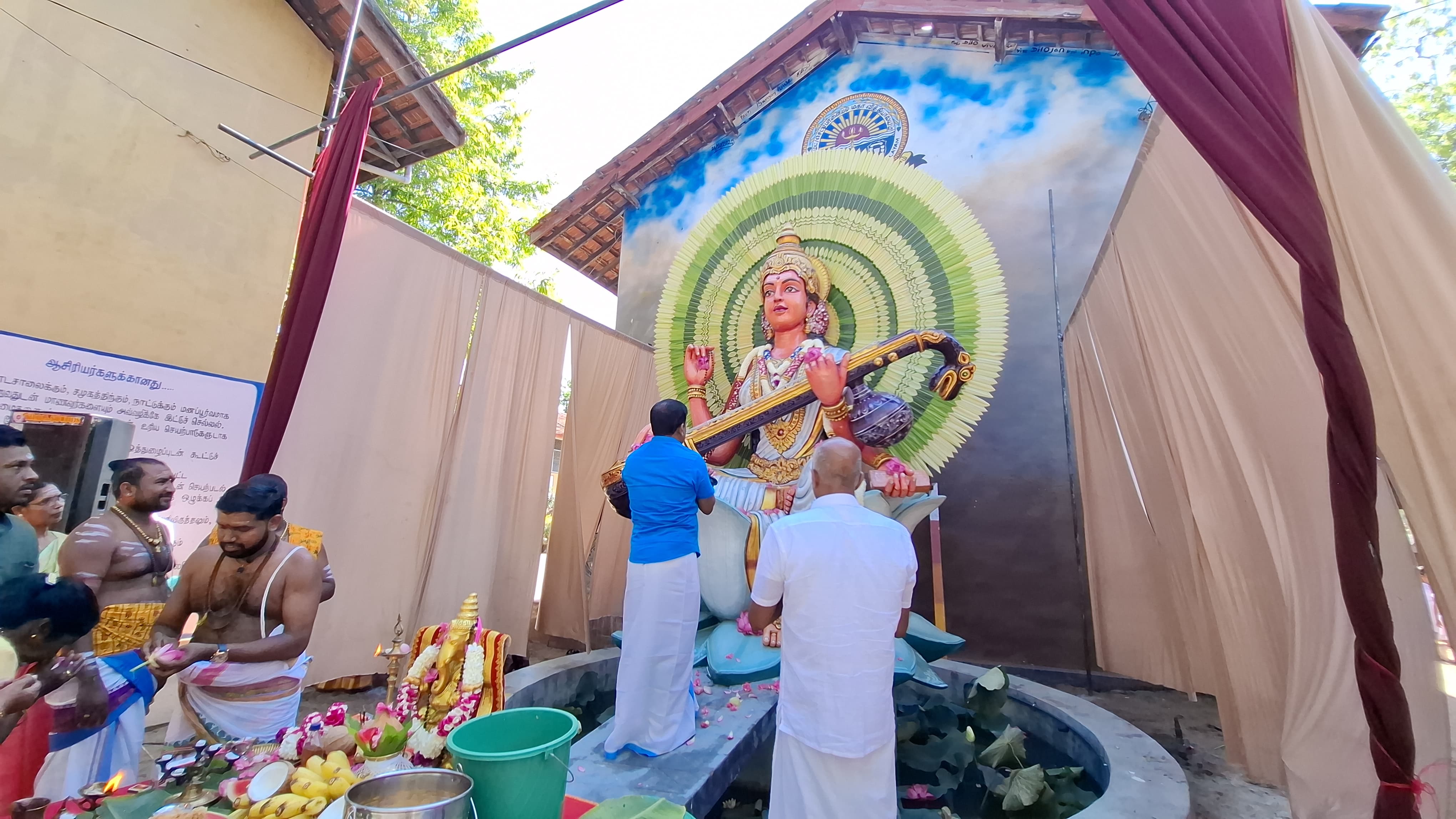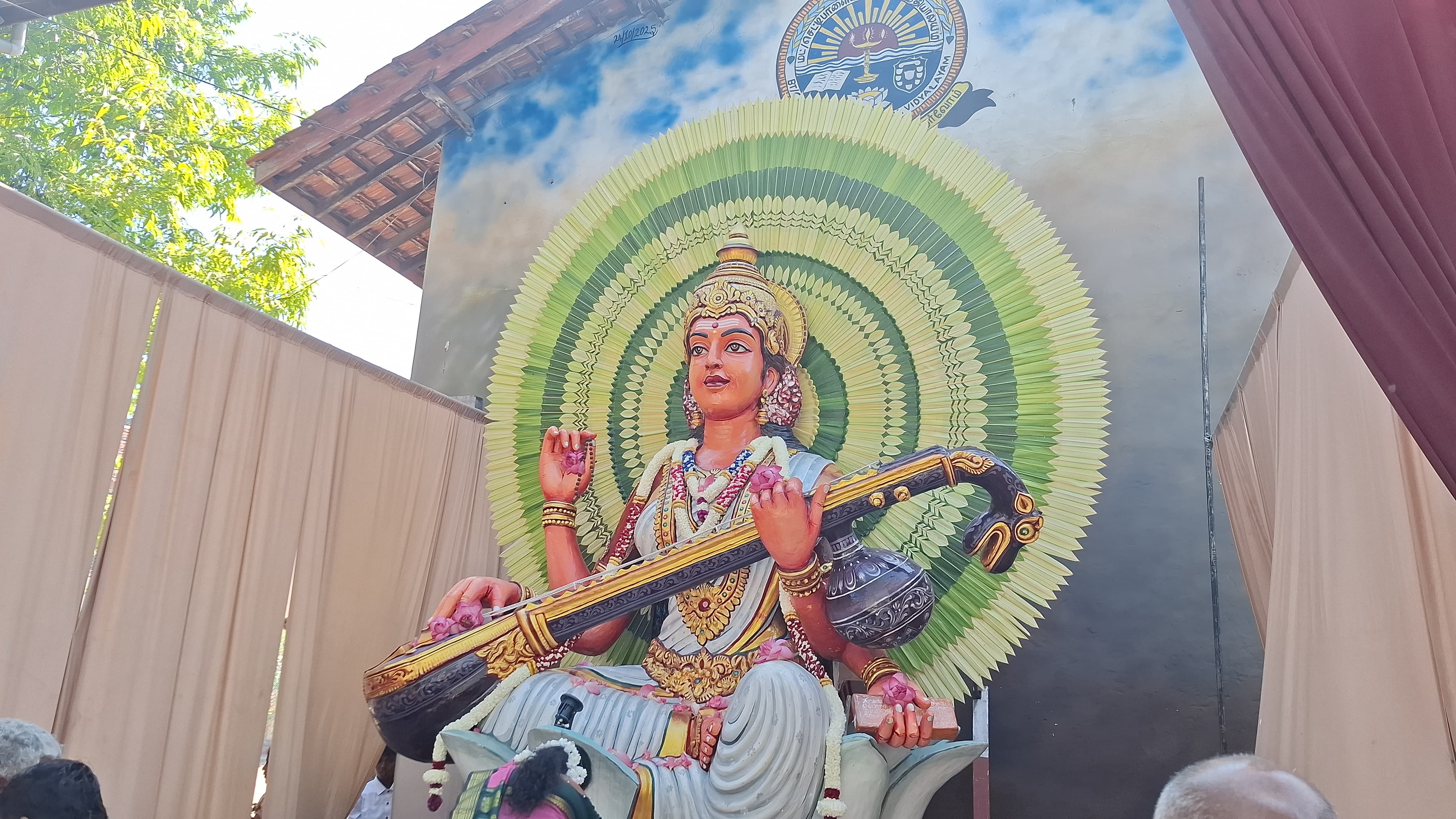 அதிதிகள் மலர் மாலை அணிவித்து, பாண்டு வாத்திய இசையுடன் வரவேற்கப்பட்டு, 12 அடி சரஸ்வதி சிலை அதிதிகளால் திரை நீக்கம் செய்யப்பட்டது.