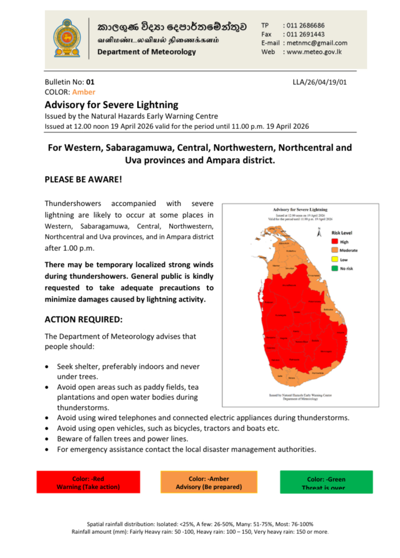 இதன்படி, மேல், சப்ரகமுவ, மத்திய, வடமேல், வடமத்திய மற்றும் ஊவா மாகாணங்களின் சில இடங்களிலும் அம்பாறை மாவட்டத்தின் சில இடங்களிலும் இடியுடன் கூடிய மழையுடன் பலத்த மின்னல் தாக்கம் ஏற்பட அதிக வாய்ப்புள்ளதாக குறிப்பிடப்பட்டுள்ளது.
