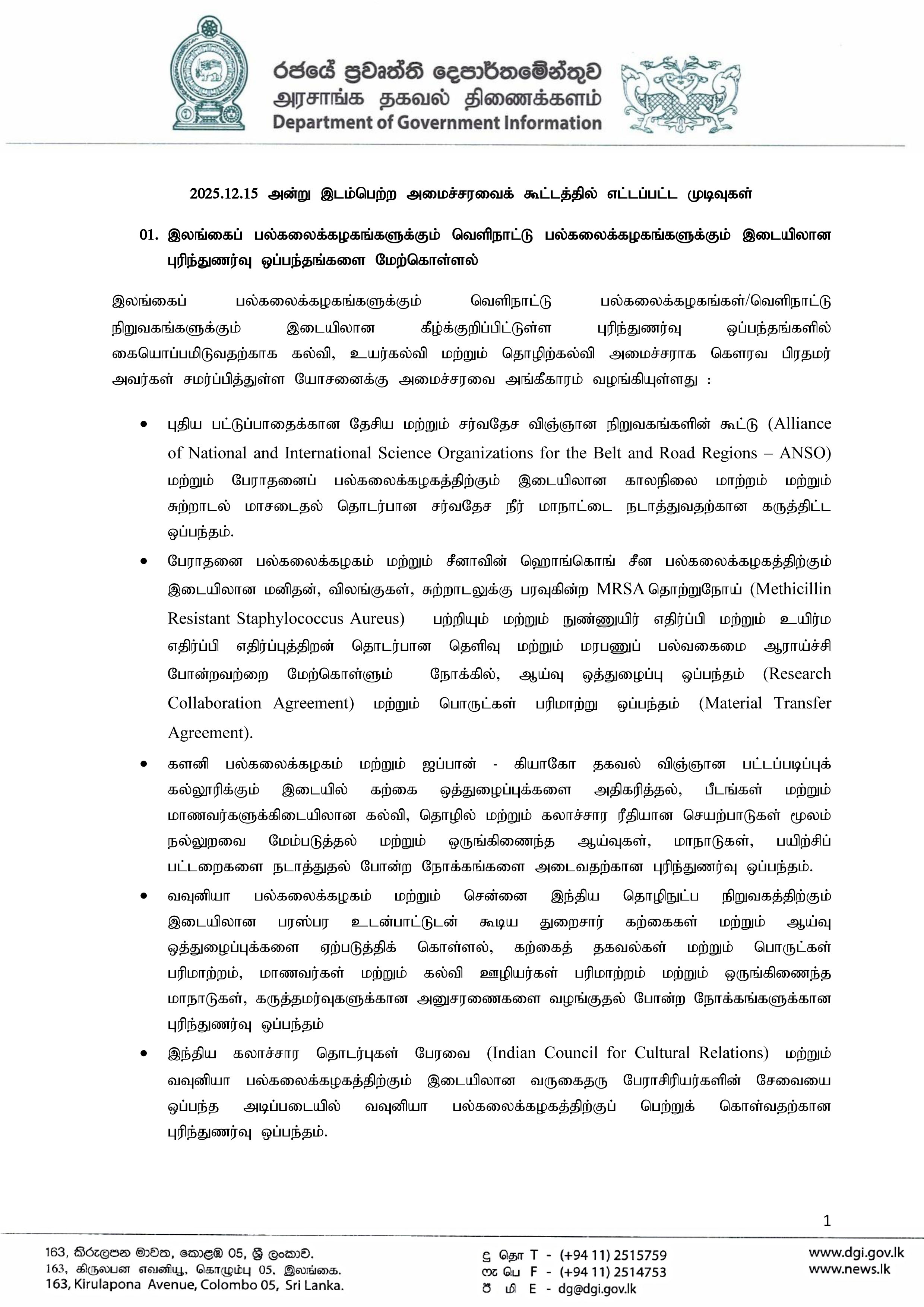 கல்வி ஒத்துழைப்பு, ஆராய்ச்சி ஒத்துழைப்பு மற்றும் அறிவு பரிமாற்றத்தை வலுப்படுத்துவதற்காக இலங்கை பல்கலைக்கழகங்களுக்கும் வெளிநாட்டு நிறுவனங்களுக்கும் இடையிலான தொடர்ச்சியான புரிந்துணர்வு ஒப்பந்தங்களுக்கு அமைச்சரவை ஒப்புதல் அளித்துள்ளது.