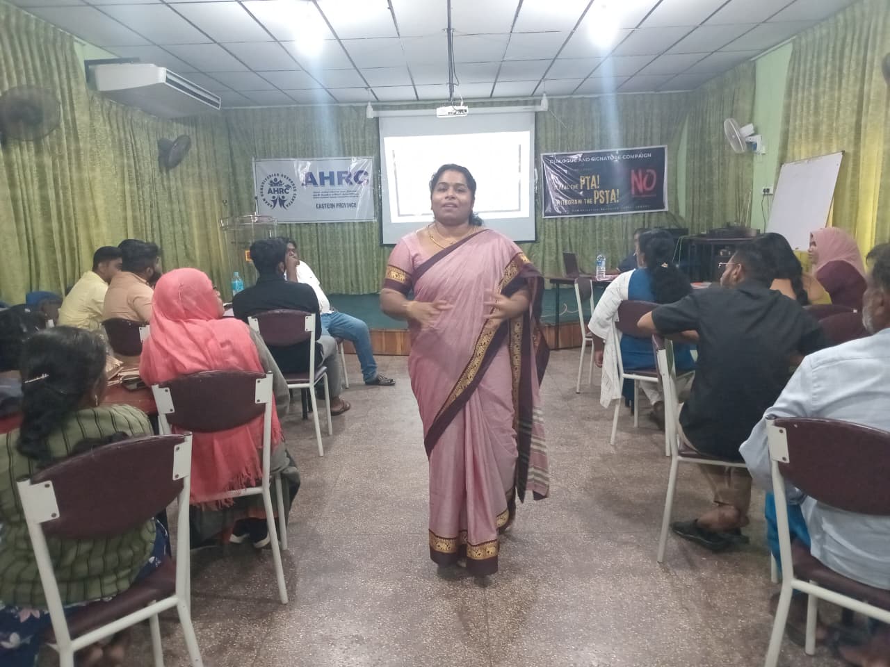 பயங்கரவாதத்திலிருந்து அரசை பாதுகாப்பதற்கான சட்ட வரைபு தொடர்பில் கலந்துரையாடல் அகம் மனிதாபிமான வள நிலையம் அமைப்பினால், இலங்கை அரசினால் கொண்டு வரப்படவுள்ள பயங்கரவாதத்தில் இருந்து அரசை பாதுகாப்பதற்கான சட்ட வரைபு தொடர்பான கலந்துரையாடல் இன்று நடைபெற்றது.இந்த கலந்துரையாடலில் திருகோணமலை மாவட்டத்திலுள்ள சிவில் அமைப்பு பிரதிநிதிகள், மனித உரிமை செயற்பாட்டாளர்கள், வலிந்து காணாமல் ஆக்கப்பட்ட உறவுகள், ஊடகவியலாளர்கள் எனப் பலரும் கலந்து கொண்டனர்.பயங்கரவாத சட்டத்தினை நீக்குக, புதிய அரசைப் பயங்கர வாதத்திலிருந்து பாதுகாப்பதற்கான சட்ட வரைபை மீளப் பெறுக எனும் மனுவில் இந்த கலந்துரையாடலில் கலந்து கொண்ட அனைவரும் கையொப்பம் இட்டனர்.மேலும் புதிய சட்டத்தின் மூலம் பொதுமக்கள் முகம் கொடுக்க உள்ள பிரச்சனைகள் குறித்து விவாதிக்கப்பட்டதுடன் பழைய சட்டத்தில் இருந்து புதிய சட்டம் இடையே உள்ள வேறுபாடுகள் குறித்து சட்டத்தரணி பிரஷாந்தினி உதயகுமார் விளக்கப்படுத்தினார்.மேலும் நிறைவேற்றப்படவுள்ள சட்டத்திலிருந்து எவ்வாறு பொது மக்களை பாதுகாப்பது குறித்து சட்டத்தரணியால் விளக்கம் கொடுக்கப்பட்டது.