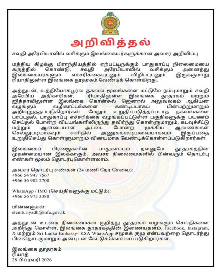 சவூதியில் வசிக்கும் இலங்கையர்களுக்கான அவசர எச்சரிக்கை மத்திய கிழக்கு பிராந்தியத்தில் ஏற்பட்டுள்ள பாதுகாப்பு நிலைமையைக் கருத்தில் கொண்டு, சவுதி அரேபியாவில் வசிக்கும் அனைத்து இலங்கையர்களும் எச்சரிக்கையுடனும் விழிப்புடனும் இருக்குமாறு இலங்கைத் தூதரகம் அறிவுறுத்தியுள்ளது. சவுதி அரேபிய அதிகாரிகள், ரியாத்திலுள்ள இலங்கைத் தூதரகம் மற்றும் ஜித்தாவிலுள்ள இலங்கைத் துணைத் தூதரகம் வழங்கும் உத்தியோகபூர்வ தகவல்களை மட்டுமே பின்பற்றுமாறு அறிவுறுத்தப்பட்டுள்ளது. அத்துடன் உறுதிப்படுத்தப்படாத தகவல்களைப் பரப்புவதைத் தவிர்க்குமாறும் ரியாத்திலுள்ள இலங்கைத் தூதரகம் விடுத்துள்ள அறிக்கையில் வலியுறுத்தப்பட்டுள்ளது. பாதுகாப்பு எச்சரிக்கை விடுக்கப்பட்டுள்ள பகுதிகளுக்குப் பயணம் செய்வதைத் தவிர்க்குமாறும், கடவுச்சீட்டு மற்றும் வதிவிட அடையாள அட்டை போன்ற முக்கிய ஆவணங்கள் செல்லுபடியாவதை உறுதி செய்து, அவற்றை எளிதில் அணுகக்கூடிய வகையில் வைத்திருக்குமாறு கேட்டுக்கொள்ளப்பட்டுள்ளனர். அவசர தொடர்புகளுக்கு (24 மணிநேர சேவை): தொலைபேசி எண்கள்: +966 54 947 7567, +966 56 982 2700 WhatsApp / IMO (தகவல்களுக்கு மட்டும்): +966 56 975 3380 மின்னஞ்சல்: slemb.riyadh@mfa.gov.lk மேலதிக தகவல்களுக்குத் தூதரகத்தின் இணையதளம், Facebook, Instagram, X மற்றும் தூதரகத்தின் WhatsApp ஆகிய சமூக ஊடகங்களை பின்தொடருமாறு ரியாத்திலுள்ள இலங்கைத் தூதரகம் அறிவித்துள்ளது.